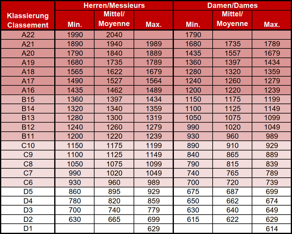 Beim Tischtennis gibt es ein Klassierungssystem und ein Rankingsystem (das sogenannte ELO-Ranking). Die Klassierungen sind sind von D1 – A22. Innerhalb der einzelnen Klassen ist der Punkte-Range enthalten (Bsp. Herren C10 zwischen 1150 - 1199 Punkte). Die Grafik am Ende der Seite zeigt die Klassierungen mit dem jeweiligen ELO-Range innerhalb der einzelnen Klasse.